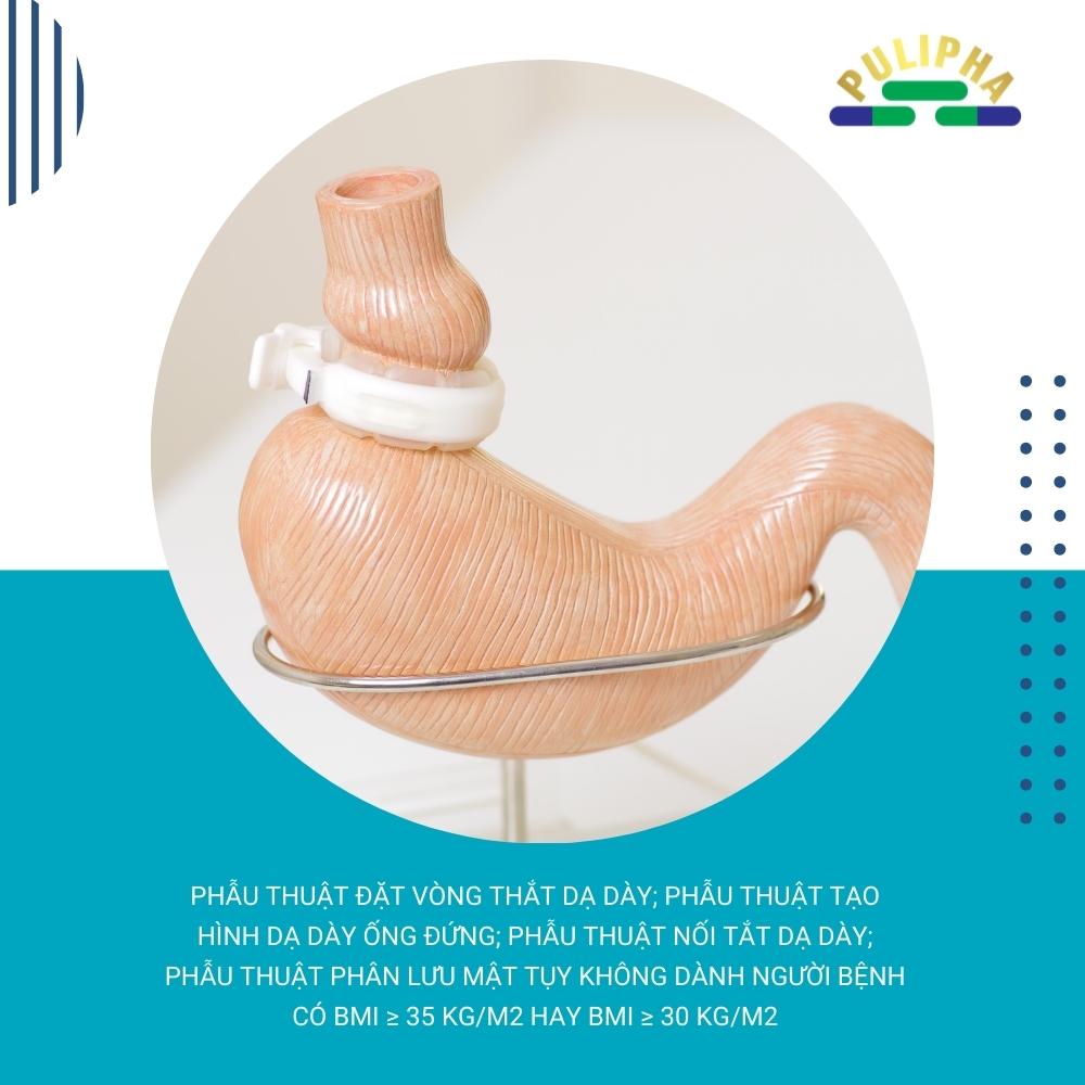 Đáng chú ý, chỉ định phẫu thuật giảm cân khi thất bại với các điều trị không phẫu thuật ở người bệnh có BMI ≥ 35 kg/m2 hay BMI ≥ 30 kg/m2 kèm bệnh lý đồng mắc liên quan béo phì, như là: Phẫu thuật đặt vòng thắt dạ dày; Phẫu thuật tạo hình dạ dày ống đứng; Phẫu thuật nối tắt dạ dày; Phẫu thuật phân lưu mật tụy; Phẫu thuật đảo dòng tá tràng; Phẫu thuật nối tắt dạ dày với 1 miệng nối (mini gastric bypass); Phẫu thuật khâu gấp nếp dạ dày; Phẫu thuật tạo hình dạ dày; Đặt bóng dạ dày (intragastric ballon – IRB).